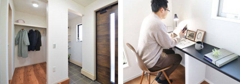 各邸の間取りには、全棟に「室内に外の汚れを持ち込ませないエントランスクローク」を設け、コートなどを部屋に持ち込まず玄関スペースに収納できます。ウイルスや花粉を部屋に持ち込むことを防げます。また、スタディーカウンターを設置しリモートワークや趣味などに活用できるワークスペースを設けました。
