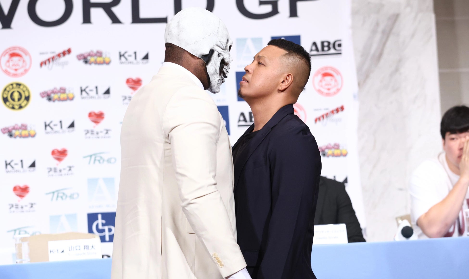 「(意味込みと対戦相手の印象)空手を代表して戦ってきたんですけど、明日は新生K-1を代表して、古いK-1を倒して、その象徴になれるような試合をしたい。相手は、スーツもお面も、すごく行儀悪いと思いますので、空手家の僕がしっかり倒します。日本の子どもたちが目指すK-1にしたいと思っているので、山口翔大が勝つところを見てください。