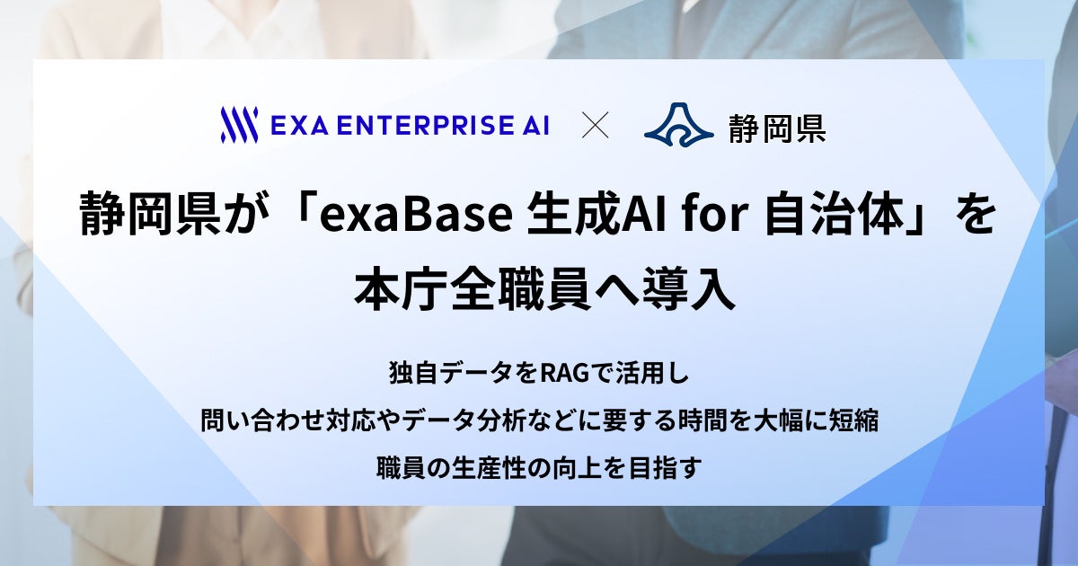 株式会社エクサウィザーズ(東京都港区、代表取締役社長:春田 真、以下エクサウィザーズ)およびグループ会社である株式会社Exa Enterprise AI(本社: 東京都港区、代表取締役: 大植 択真、以下Exa Enterprise AI )は、静岡県(静岡市葵区、静岡県知事:鈴木 康友) が、「exaBase 生成AI for 自治体」を本庁全職員に導入したことをお知らせします。自治体向け生成AIサービスとして、2024年7月からの検証を経て2024年12月に導入しました。静岡県は、生成AIのRAG(データ連携)*を積極的に活用し、問い合わせ対応用の文章、資料の作成やデータ分析など様々な行政業務の生産性を向上していきます。