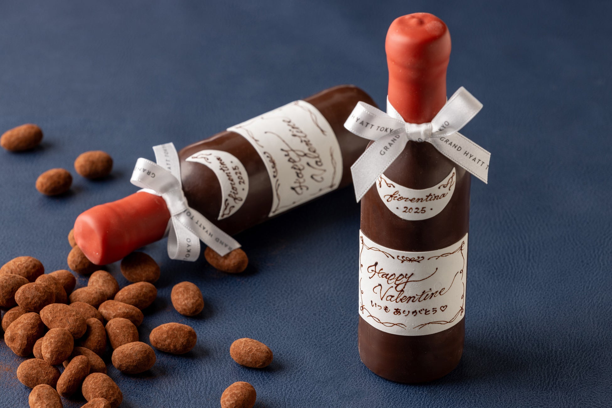 ワインボトル丸々一本がホテルオリジナルのチョコレート「Grande H」でできた、ユニークなチョコレートが新登場します。ワインボトル型のチョコレートの中には、ローストしたアーモンドをチョコレートでコーティングした香り豊かなアマンディーヌを忍ばせました。チョコレートでできたラベルには大切な方へ向けたお好きなメッセージを入れることも可能です。