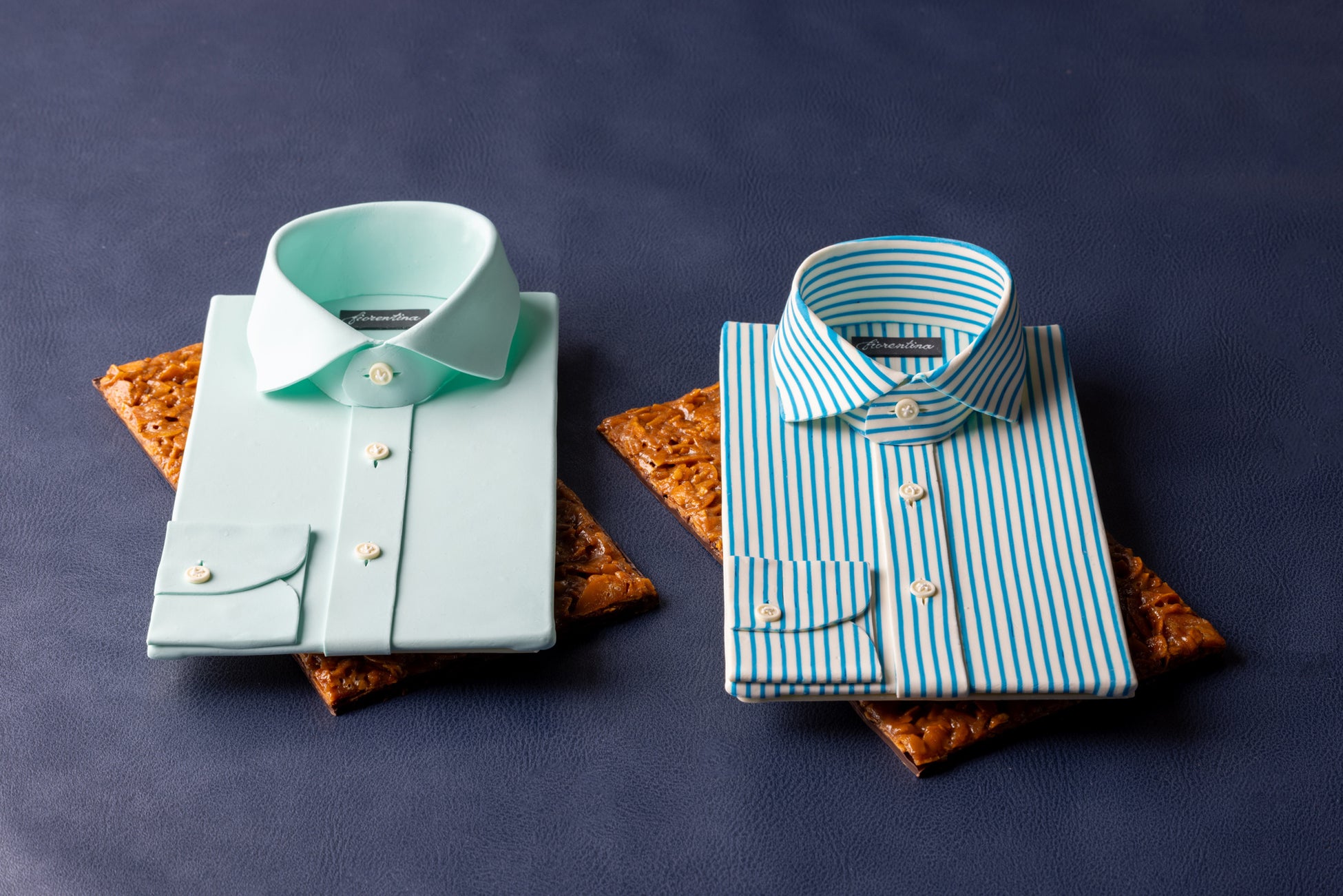 ボタンの縫い目や襟の細部まで忠実に再現した本物そっくりなシャツ型チョコレートを、ストライプ柄と無地の2種類でご用意いたします。ホワイトチョコレートをつかい、手作業でひとつずつつくる繊細なシャツの下には、店舗名の由来にもなっており、開業時から変わらないレシピで愛され続けているスイーツ「フィオレンティーナ」を敷いています。「フィオレンティーナ」は、ナッツをカリカリにキャラメリゼし、裏面にはビターチョコレートをコーティングする、キャラメルとチョコレートのほろ苦さの中にナッツの風味をお楽しみいただけるフロランタンです。大切な方と一緒に少しずつお召し上がりいただくのもおすすめです。