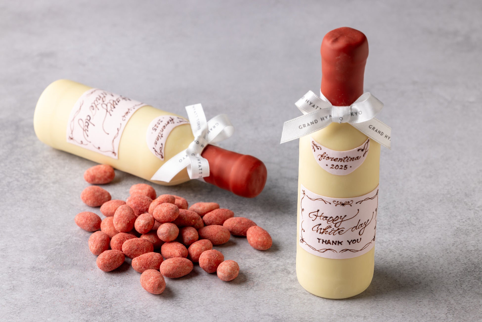 ユニークなワインボトル型のチョコレートがホワイトデー仕様で登場いたします。ワインボトル型のホワイトチョコレートの中には、ローストしたアーモンドをストロベリーチョコレートでコーティングした、香り豊かなストロベリー アマンディーヌをふんだんに忍ばせました。チョコレートでできたラベルにはお好きなメッセージを入れられます。