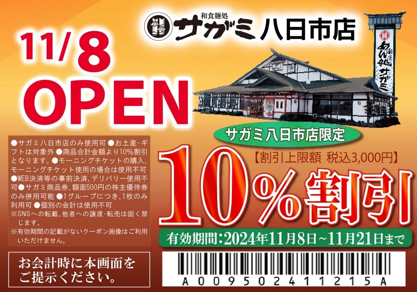 また、サガミ八日市店限定でご利用いただける割引券を記載いたしました。この画面を掲示で期間中、何度でもご利用いただけます。