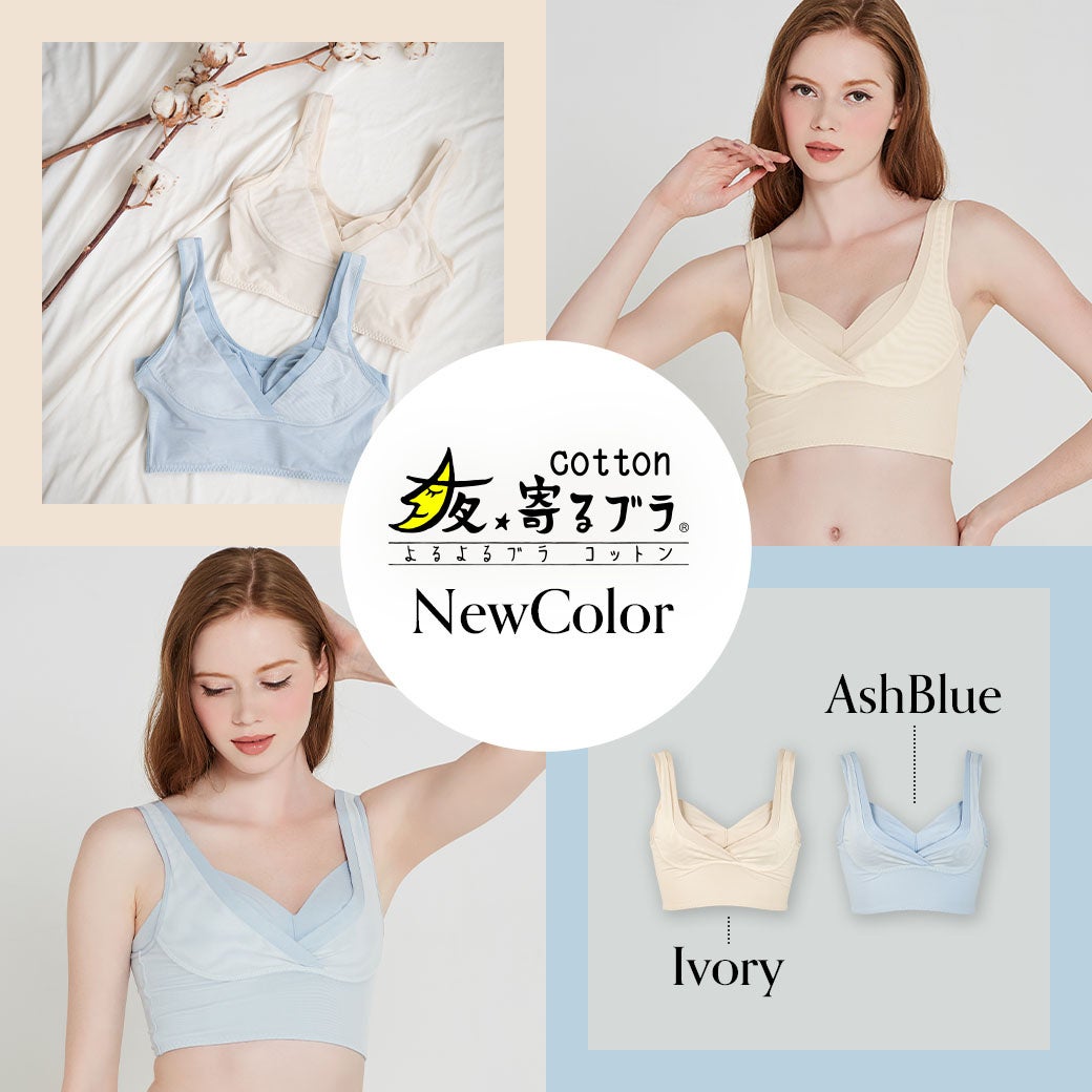 通気性・吸水性のよいコットン素材で、寝ている間にバストケアできる大人気ナイトブラ「夜寄るブラ コットン」に新色・アイボリーとアッシュブルーが登場
