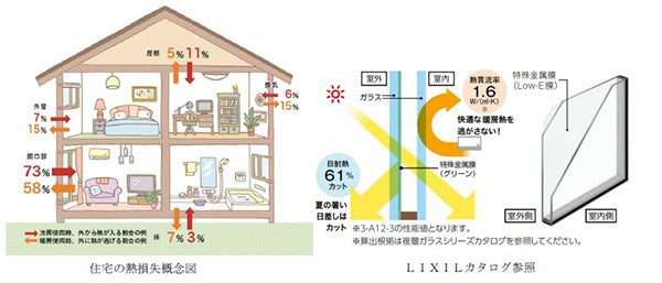 熱は、住宅の外壁・屋根・窓などから出入りしますが、夏は家に流入する熱の約73%、冬は家から流出する熱の約58%が窓から出入りしていると言われています(※1)。本物件では、全窓にLow-E複層ガラスグリーン(高遮熱仕様)を採用しており、特殊金属膜を室外側のガラスに施すことで、一般複層ガラスと比較して約1.5倍の断熱効果を実現しています。夏の熱い日射熱の60%をカットし、エアコン効率を高める効果があります。また、紫外線も82%カットします(※2)。