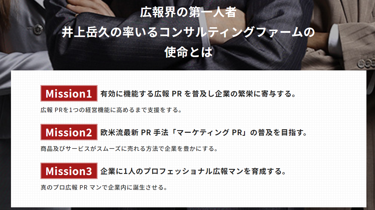 戦略広報の実践実務の第一人者で、トップ広報コンサルタントと称される井上岳久が率いるコンサルティング