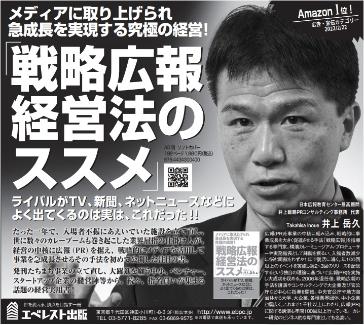 日本で唯一のカレー専門のコンサルティング会社である株式会社カレー総合研究所(所長:井上岳久/東京都渋谷区)は、所長の井上岳久が井上戦略PRコンサルティング事務所代表として日本を代表する広報PRコンサルタントとして有名ですが、この度、新著『メディアに取り上げられ急成長を実現する究極の経営! 「戦略広報経営法のススメ」』をエベレスト出版から2022年2月に発売し1年が経ちました。Amazon第1位など、おかげさまで順調に売り上げを伸ばしております。