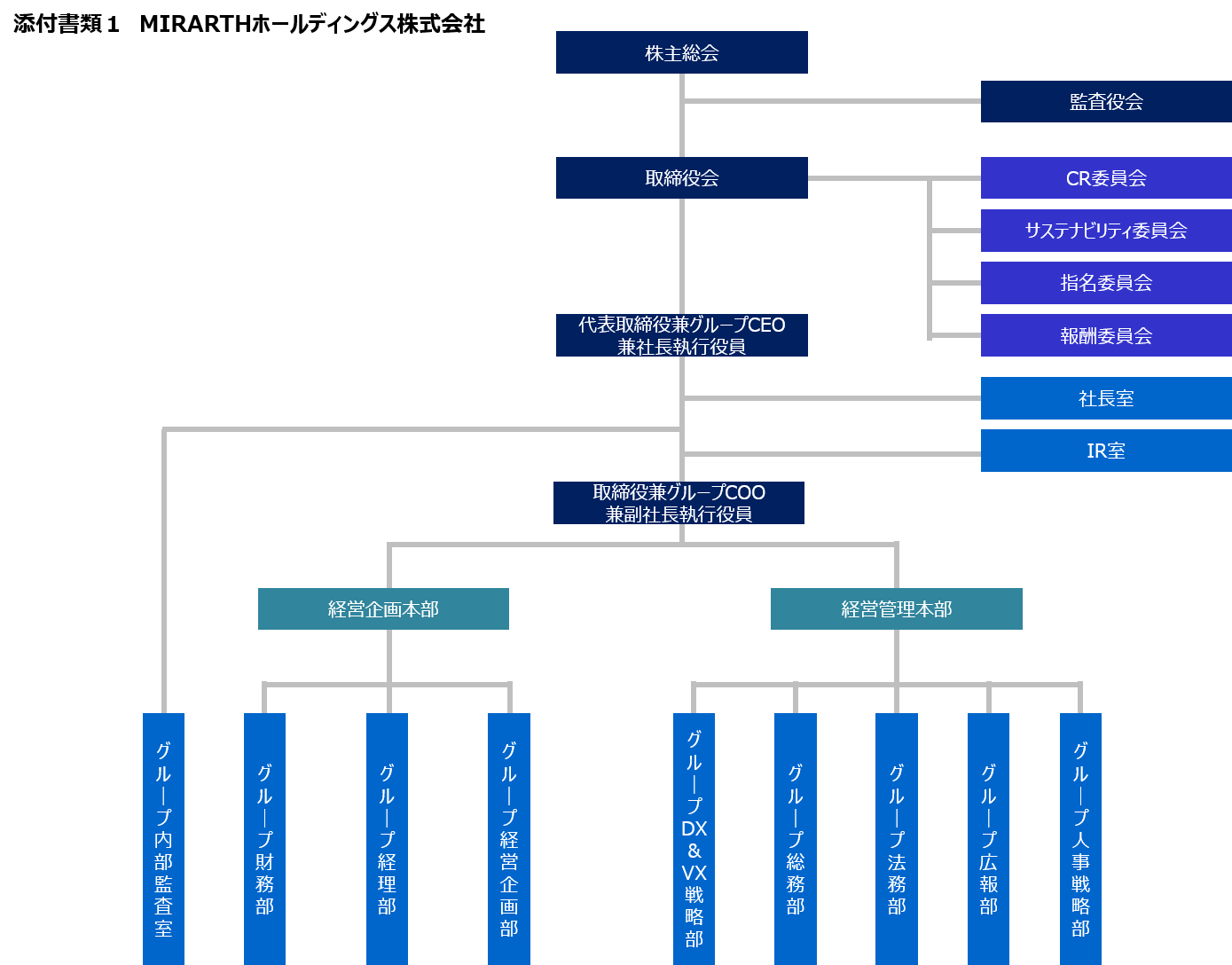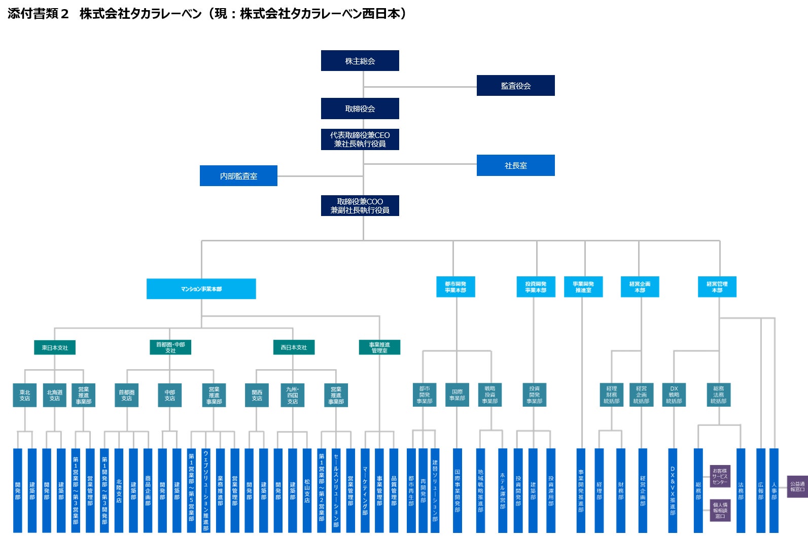 この持株会社体制への移行に伴い、本日開催の取締役会において、次のとおり、「MIRARTHホールディングス株式会社」及び当社の事業を承継する「株式会社タカラレーベン西日本(2022年10月1日付で「株式会社タカラレーベン」に商号変更予定)」の組織体制について決議いたしましたので、お知らせいたします。