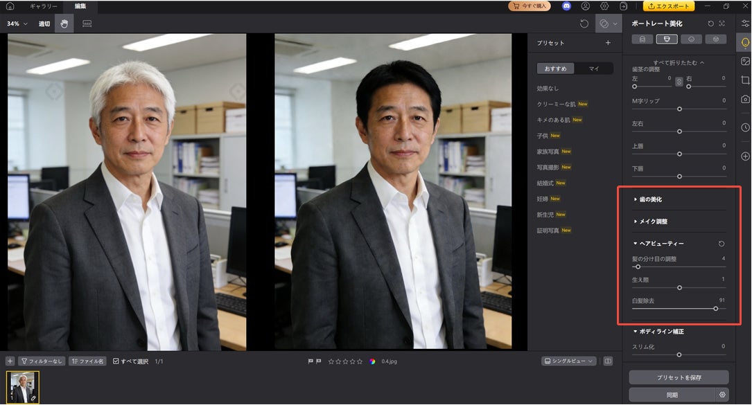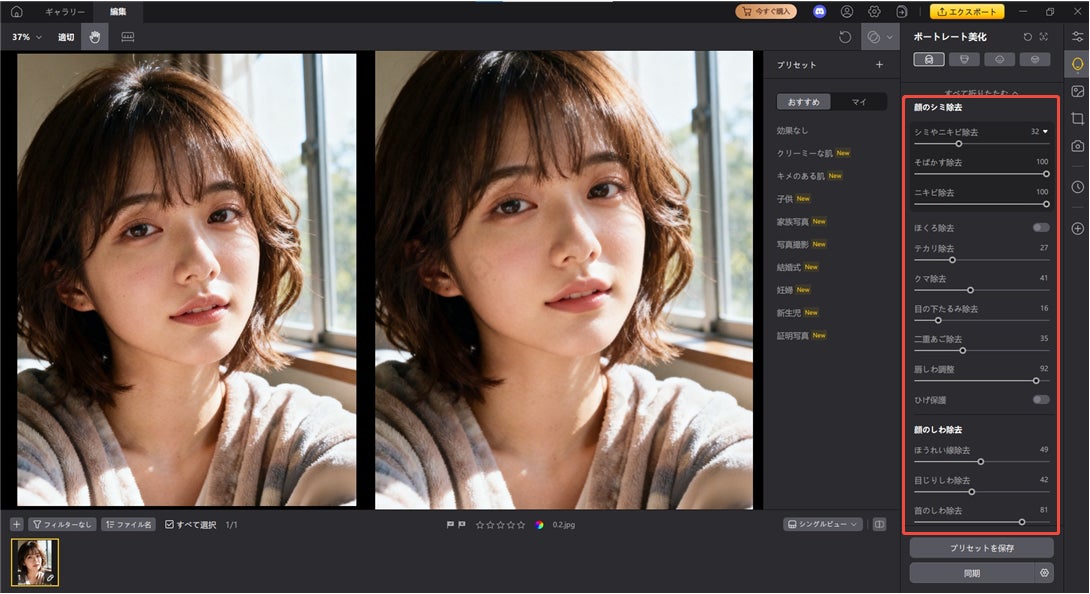 顔のシワ除去:目元や額の細かいシワを滑らかにし、若々しい色素薄い系顔立ちに。
