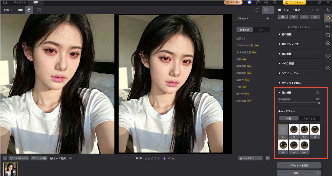目部強化:赤血絲除去とキャッチライトで、キラキラしたぱっちり目に。疲れ知らずの明るい目元が手に入ります。