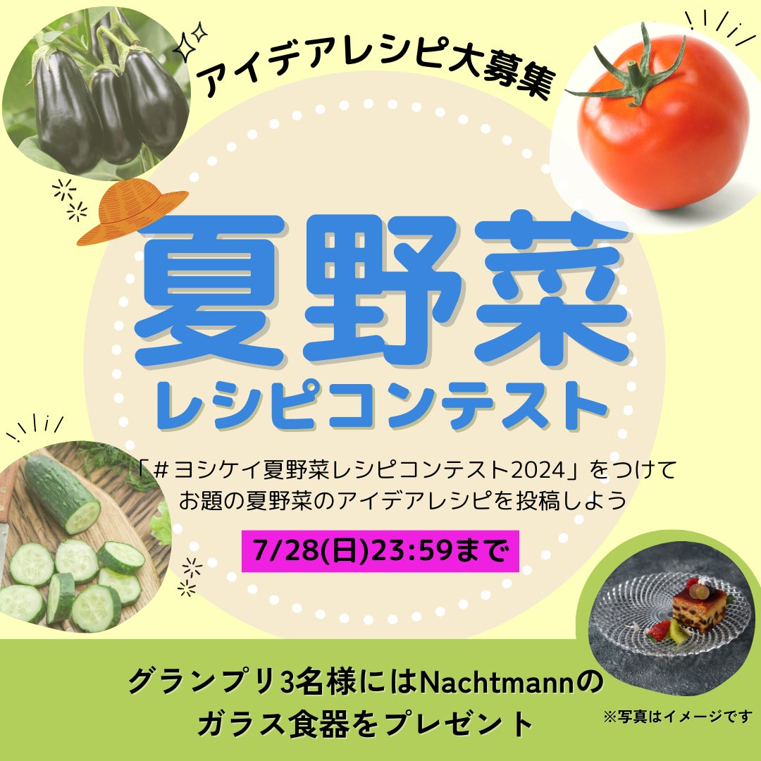 つくる人から笑顔に。をテーマに全国でミールキット宅配サービスを提供するヨシケイグループ(本部所在地:静岡県静岡市 / 代表取締役:井野口 雄一)は、公式Instagramにて「夏野菜レシピコンテスト」を開催。トマト・なす・きゅうりの3部門を設け、アイデアレシピを募集します。各部門グランプリ1名様には夏野菜が映えるガラス食器「Nachtmannジャポネスクシリーズ/華Hanaプレート23cm(2枚入)」をプレゼントします。
