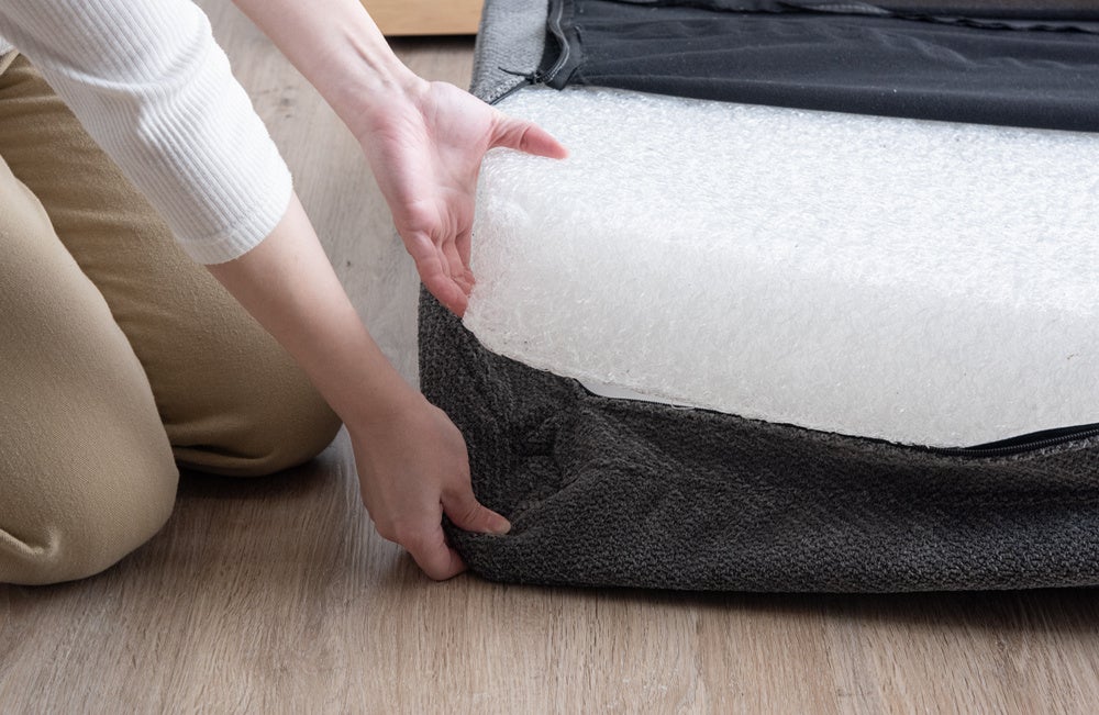 従来のソファでは液体などの汚れが染み込んだ場合、濡れたタオルで拭き取る程度しかできず、座面内部の汚れを取り去ることは困難でした。本製品は、カバーを外した座面をシャワーで丸洗いできる構造により、深部まで染み込んだ汚れも洗浄可能なため常に清潔な状態でお使いいただけます。