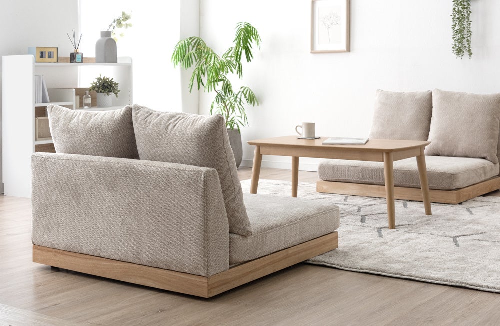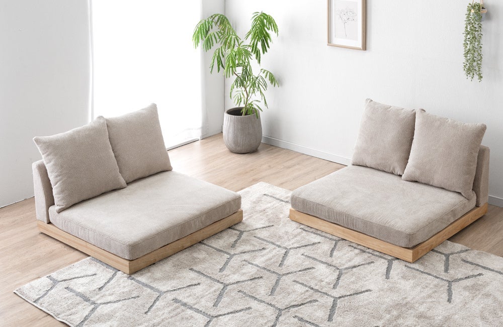 本製品は、肘掛けがないアームレスデザインを採用しています。 レイアウトや用途が固定されてしまいがちなソファの肘掛けを設けないことで、引っ越しや模様替えなどのシーンで様々なレイアウトの選択肢を増やすことを可能にしています。また、2個セットと3個セットの販売を行っているため、お部屋の広さや用途に応じて最適なセットをお選びいただけます。