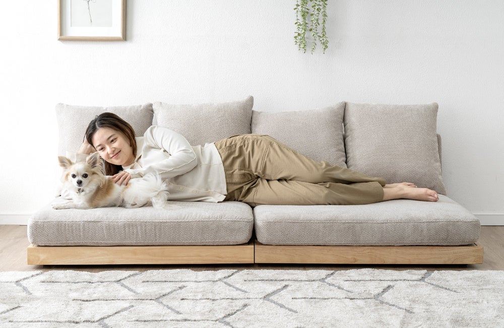 本製品は、幅180cm・奥行80cmの超ワイド設計で、ゆったりとした座面が特長です。座面をフラットにすることで、あぐらをかくことはもちろん、大人2人がゆとりをもって座ることができ、ソファベッドのように横になることも可能です。