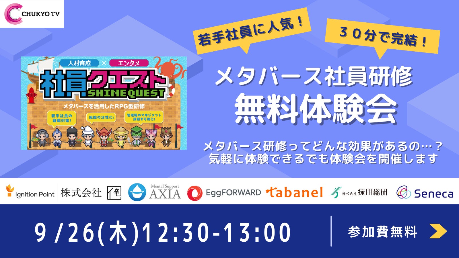 中京テレビが展開するメタバースのゲーム性と匿名性を活かすRPG型ワークショップ「社員クエスト」の無料体験会を実施します。実際に空間に入っていただき、操作感をご体験ください。