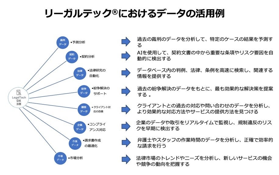 これらの例からもわかるように、リーガルテック®︎領域におけるデータの活用は、法律業務の効率化、質の向上、新しいサービスの提供など、多岐にわたる利点をもたらします。データを適切に活用することで、法律業界も大きな変革と進化を遂げています。