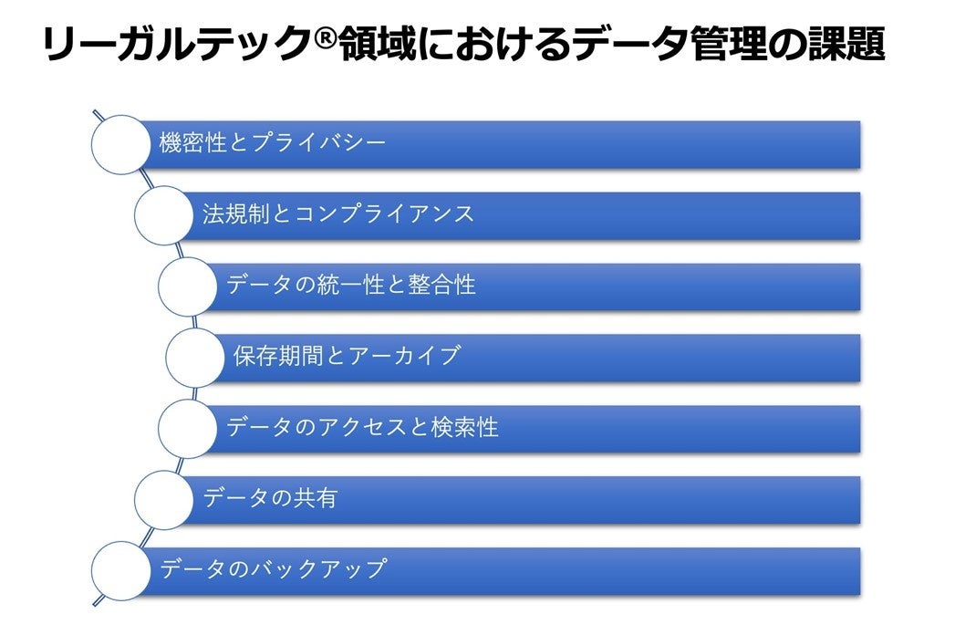 リーガルテック®︎ (LegalTech) におけるデータ管理には、特有の課題や考慮点が多数存在します。以下はその主な課題を挙げます。