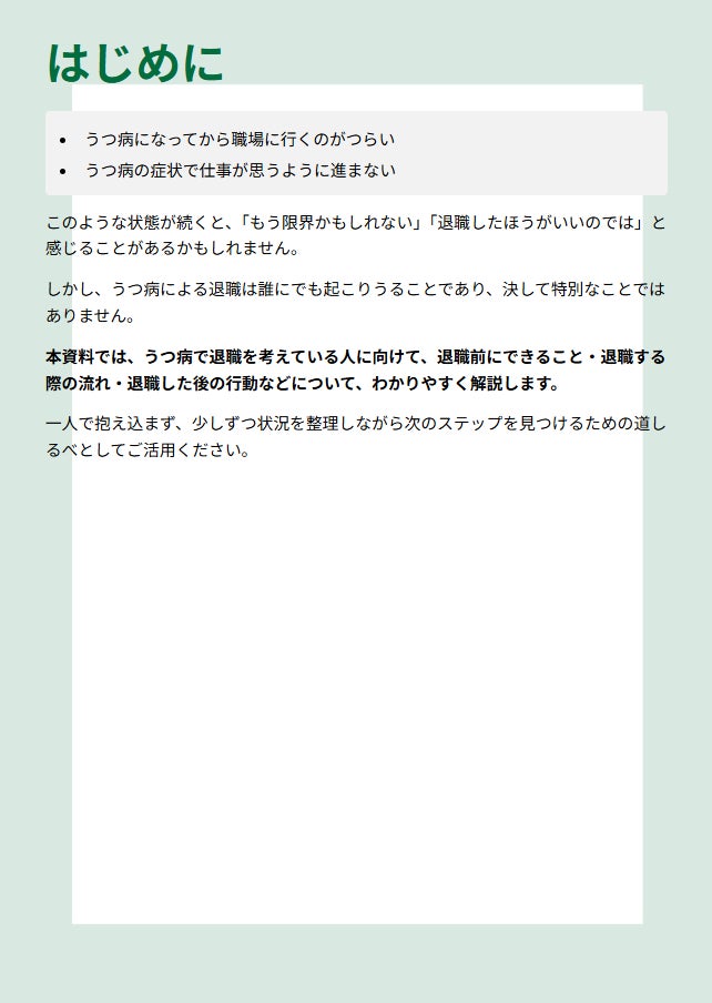 本資料では、うつ病で退職する前の段階から、実際に退職する際の流れ、退職後にすべきことなどをわかりやすく解説します。
