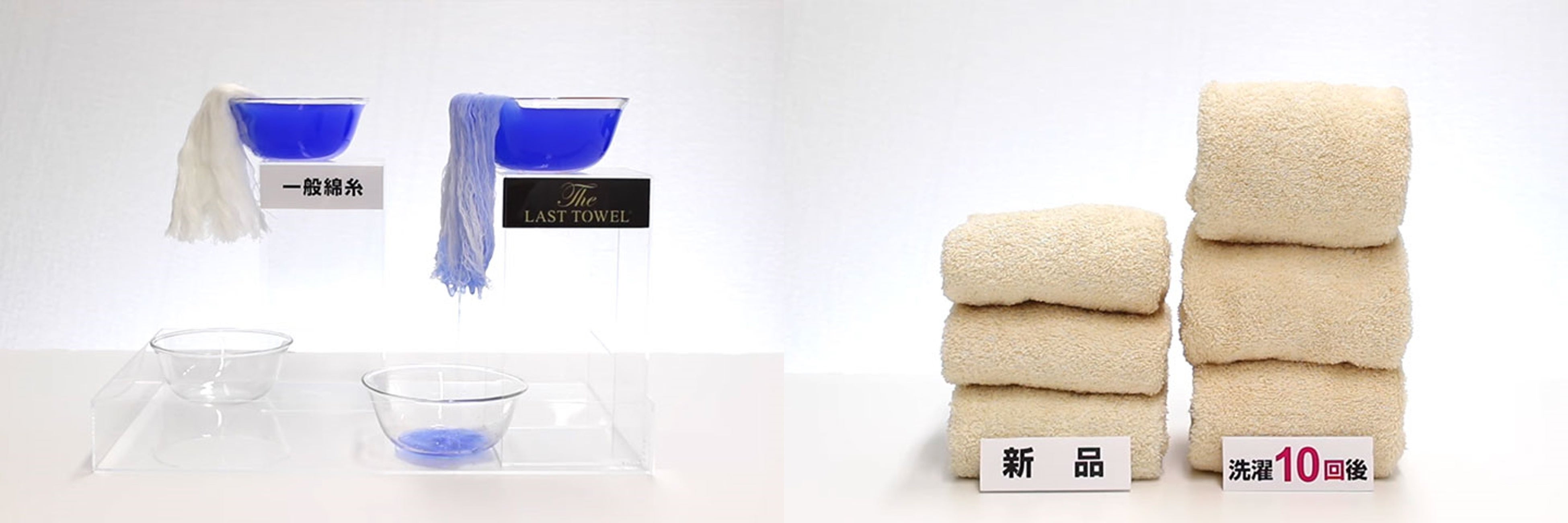 「くまもかわくタオルキャップ」の生地は、特殊な綿糸「スーパーZERO」により織り上げられた、「ザ・ラストタオル」を使用しています。綿100%の一般タオルに比べて吸水性が高く、みるみる水分を吸収します。洗髪後にキャップを頭にかぶるだけで、ぐんぐん水分を吸い取ってくれます。