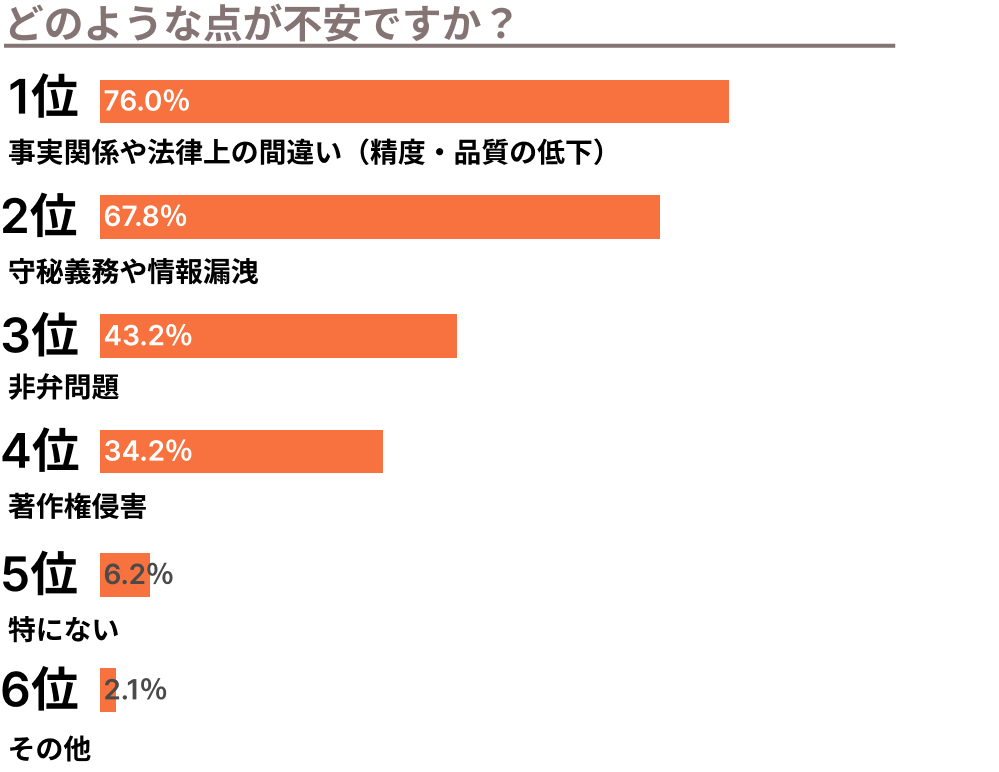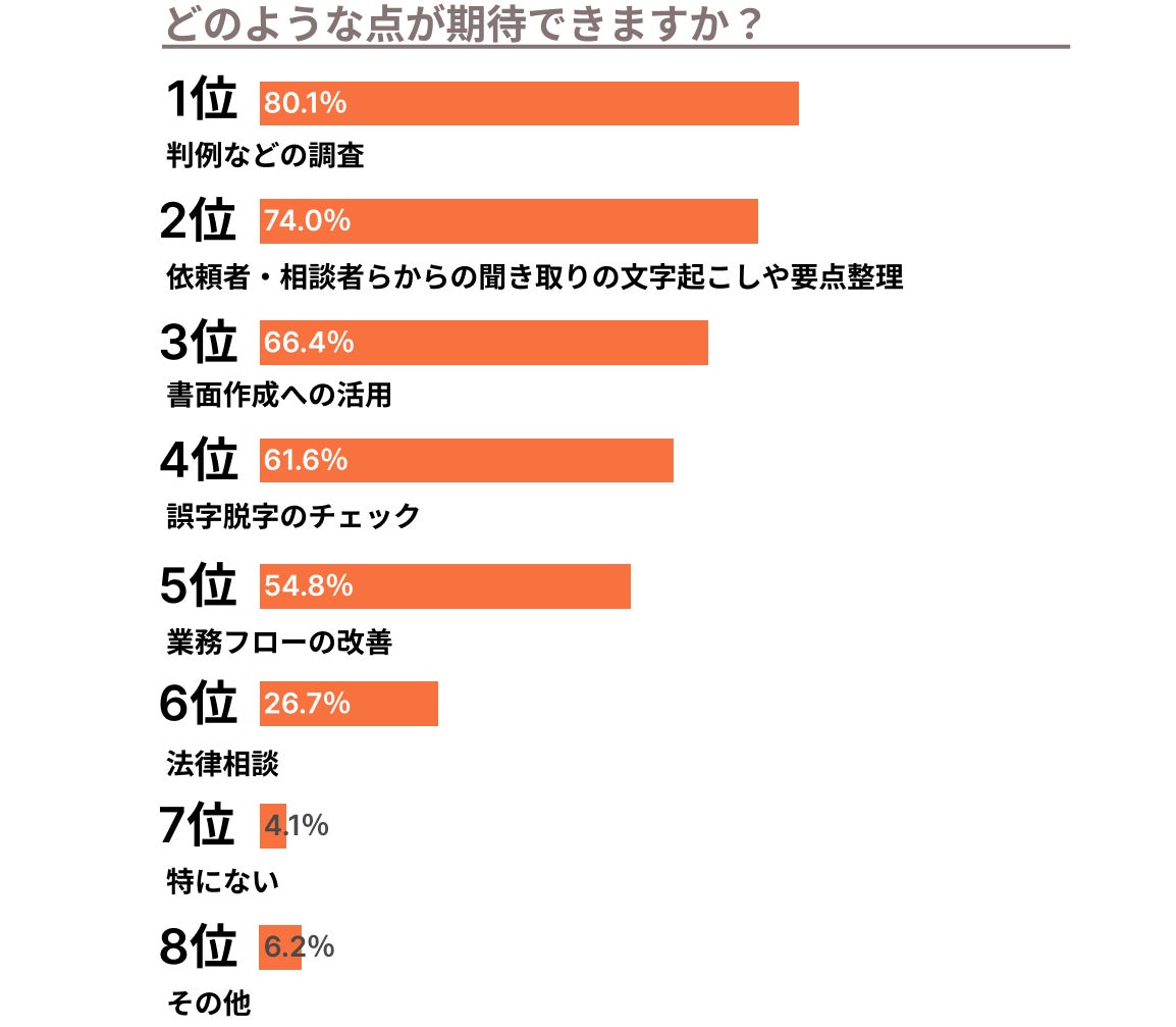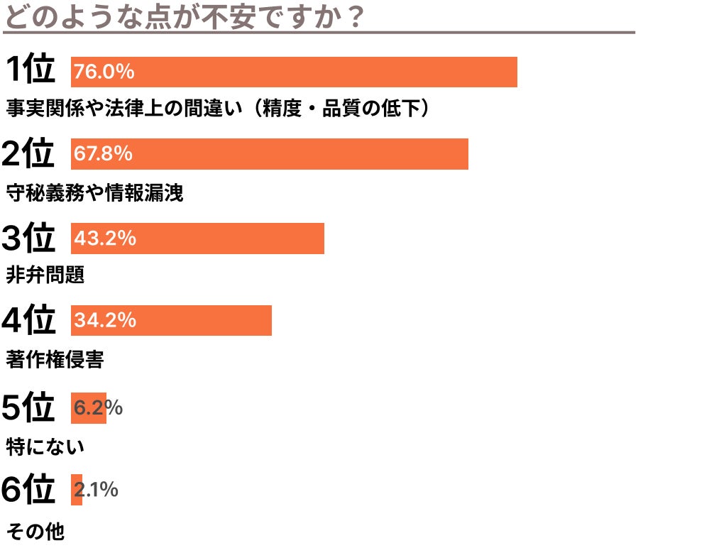 期待の1位は「判例などの調査」、2位「依頼者・相談者らからの聞き取りの文字起こしや要点整理」と作業効率への期待が窺えた一方で、不安の1位は「事実関係や法律上の間違い」、2位「守秘義務や情報漏洩」とこちらも弁護士業務に関するものが上位を締めています。
