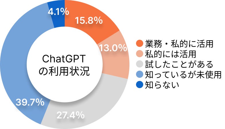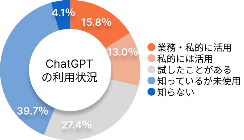 ChatGPTの利用状況について尋ねたところ、「知っているが未使用」が39.7%と一番高く、「業務・私的に活用」「私的に活用」と活用自体したことがあるは28.8%という結果となりました。