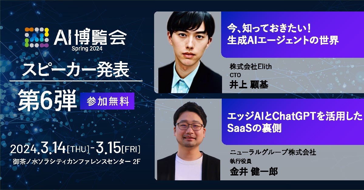 AI博覧会、第6弾スピーカーを発表!Elith 井上氏、ニューラルグループ 金井氏が講演!