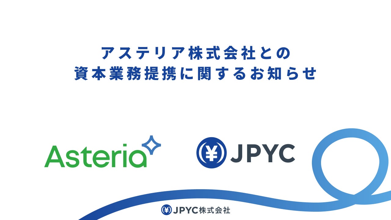 JPYC株式会社(本社:東京都千代田区、代表取締役:岡部 典孝、以下「当社」)は、アステリア株式会社(本社:東京都渋谷区、代表取締役社長:平野 洋一郎、東証プライム:3853、以下「アステリア社」)と、資本業務提携を行うことについて合意いたしましたので、お知らせいたします。