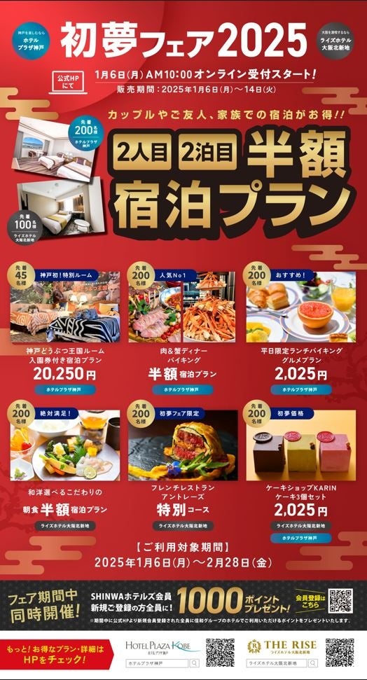 信和ホテルズ株式会社(本社:神戸市東灘区)が運営する「ホテルプラザ神⼾」「ライズホテル大阪北新地」は2025年1月6日(月)~14日(火)まで、初夢フェア2025にて特別価格で宿泊プランやグルメプランの販売をいたします。