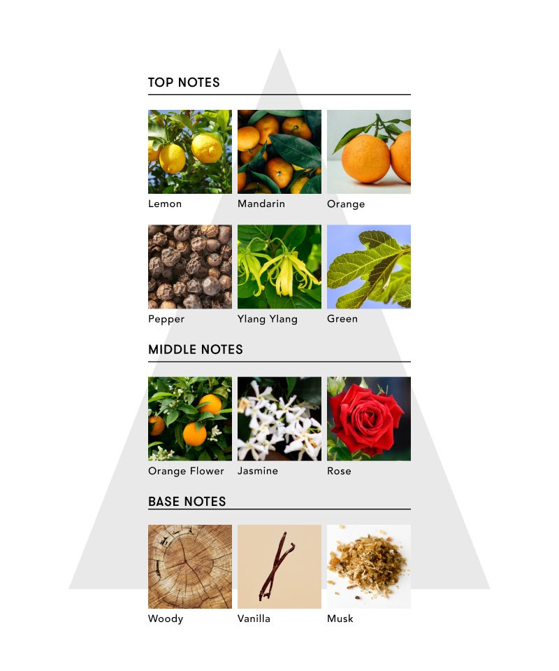 TOP:Lemon,Mandarin,Orange, Pepper, Ylang ylang, Green