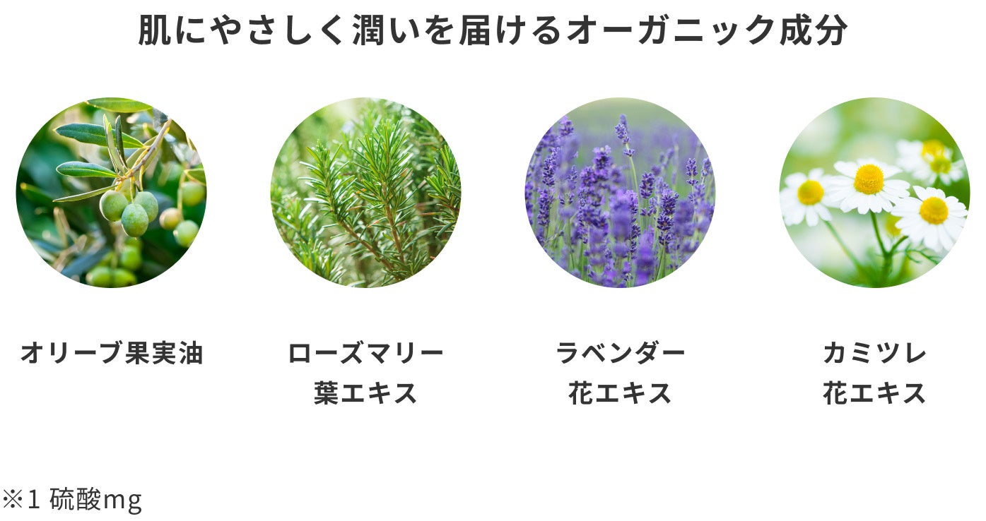 厳選配合された保湿成分やオーガニック成分で、バスタイムに全身を優しくケア。
