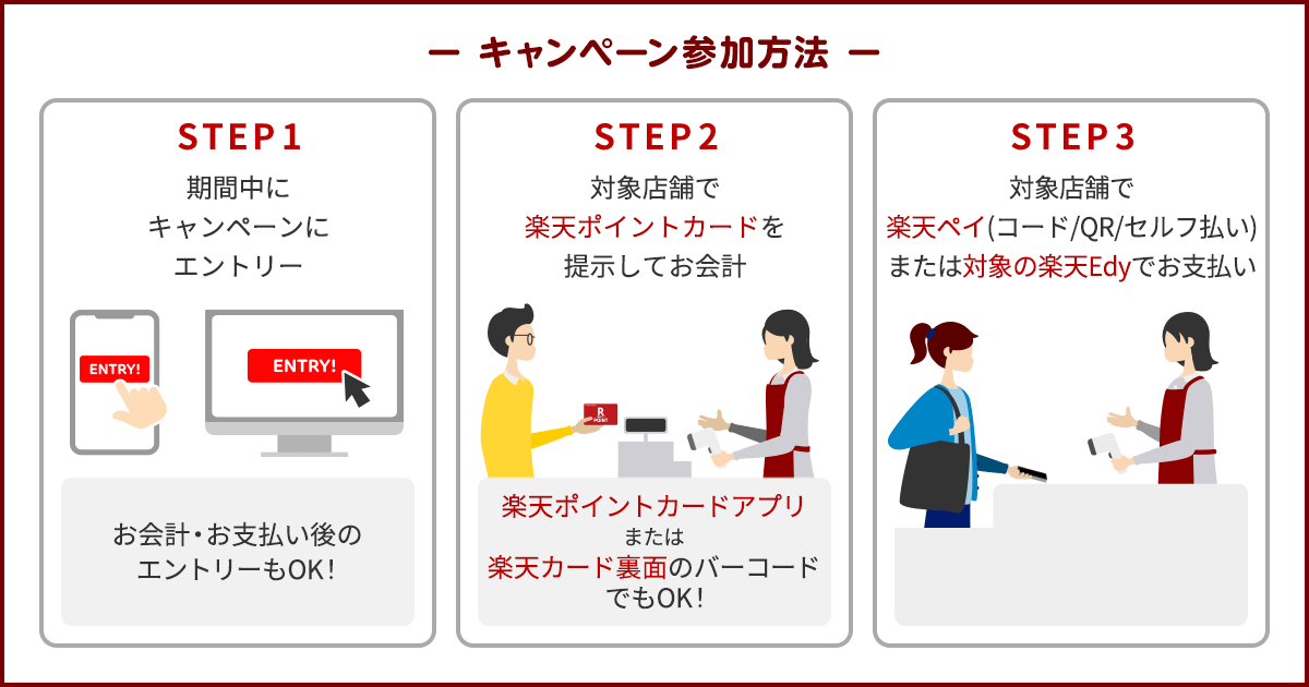 本キャンペーンでは、キャンペーン期間中にエントリーのうえ、対象店舗で「楽天ポイントカード」もしくは「楽天ポイントカード」機能が搭載されたアプリを提示して、「楽天ペイ」アプリのコード・QR払い・セルフ払い、または「楽天Edy」で、支払いをすると、抽選でポイントを進呈します(注)。