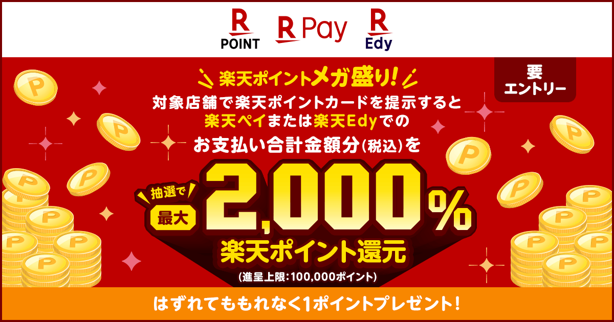 | キャンペーン内容 | キャンペーン期間中にエントリーのうえ、対象店舗で「楽天ポイントカード」もしくは「楽天ポイントカード」機能が搭載されたアプリを提示して、「楽天ペイ」アプリのコード・QR払い・セルフ払い、または「楽天Edy」で支払いをすると、以下の通り抽選でポイントを進呈します。 特賞:50名様 支払い合計金額の2,000%のポイント進呈 1等:500名様 支払い合計金額の100%のポイント進呈 2等:5,000名様 支払い合計金額の10%のポイント進呈 3等:50,000名様 支払い合計金額の1%のポイント進呈 4等:上記対象者以外全員に1ポイント進呈 さらに、以下の通り条件を達成すると当選確率が最大3倍にアップします。 ①「楽天ペイ」アプリ内の「楽天ポイントカード」を提示。(+1倍) ②「楽天ペイ」アプリのコード・QR払い・セルフ払い、または「楽天Edy」で期間中合計30,000円(税込)以上支払い。(+1倍) ※「楽天ポイントカード」の利用登録が必要です。 ※ポイント進呈対象金額は、期間中に対象店舗で「楽天ペイ」アプリのコード・QR払い・セルフ払い、「楽天Edy」で支払いをされた合計金額分(税込)となります。 ※ポイント進呈は、一人あたり最大100,000ポイントまでとなります。 ※「楽天ポイントカード」の提示と「楽天ペイ」アプリのコード・QR払い・セルフ払い、「楽天Edy」での支払いは、それぞれ別の店舗でもキャンペーンの対象となります。 ※「楽天ポイントカード」を提示した楽天ID、「楽天ペイ」アプリ、「楽天Edy」で支払いをした楽天IDが異なる場合は、当キャンペーンの対象外となります。 |