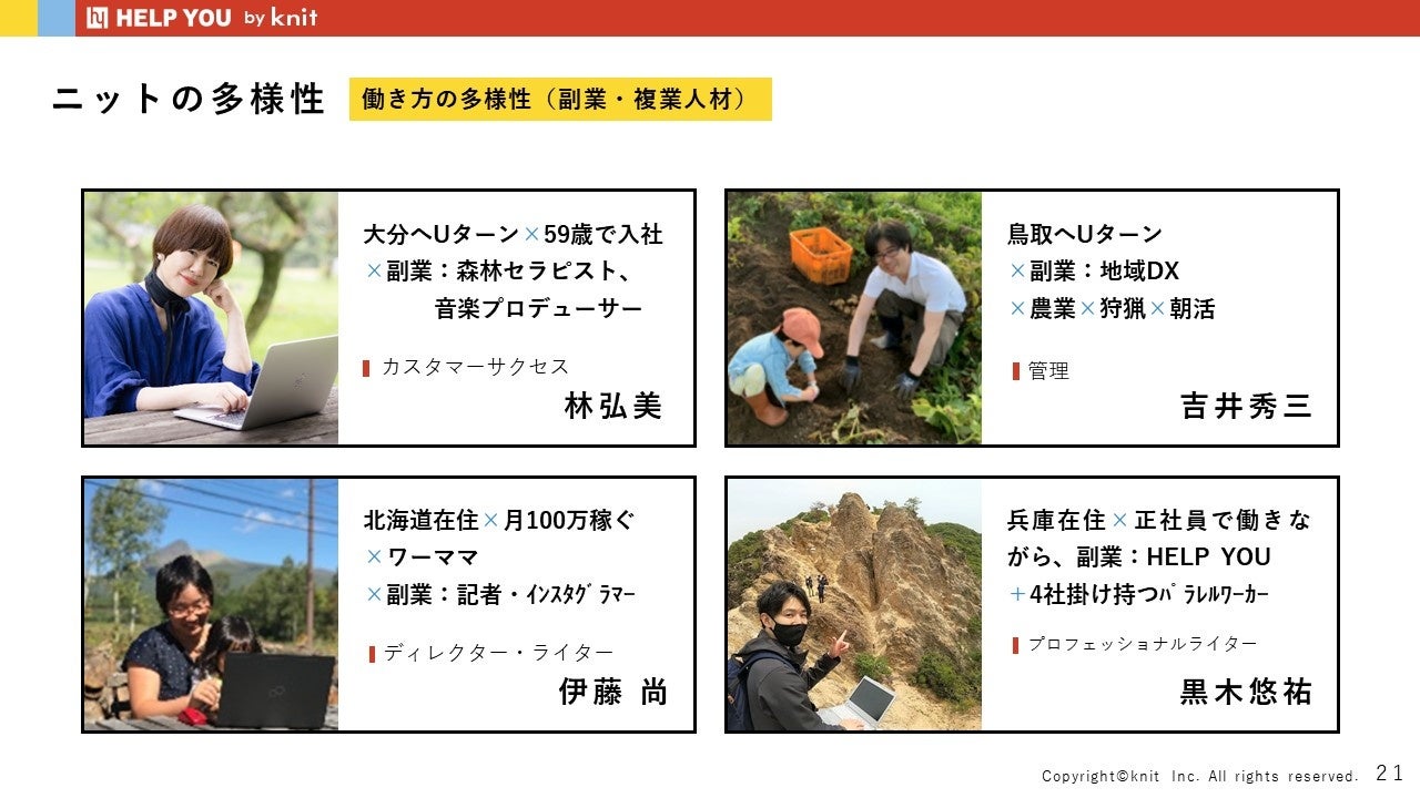 副業・複業をしているメンバーも多く在籍しており、地方で農業をしながらフルリモートで働いたり、4社と掛け持ちをしながら働いているメンバーもいます。