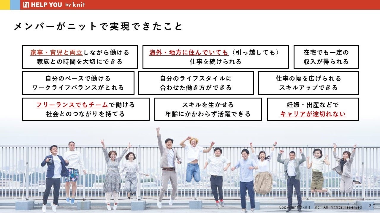 「家事・育児と両立しながら働ける」「海外・地方に住んでいても仕事を続けられる」「自分のライフスタイルに合わせた働き方ができる」など「未来を自分で選択できる社会をつくる」ビジョンに向かって、メンバーが活躍中です。