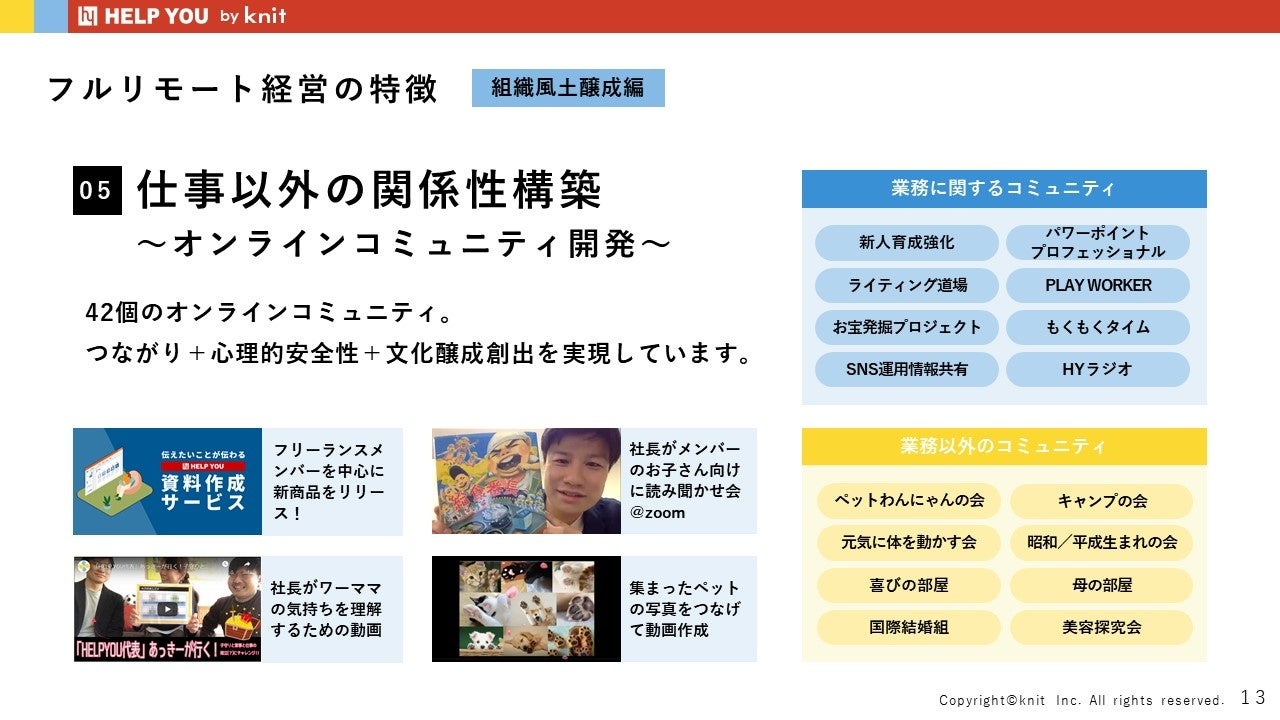 ニットには多くのオンラインコミュニティがあり、業務に関するものや、業務以外のコミュニティもあります。人と人とのつながりと、心理的安全性、文化醸成創出を実現し、メンバーのエンゲージメント向上をはかっています。
