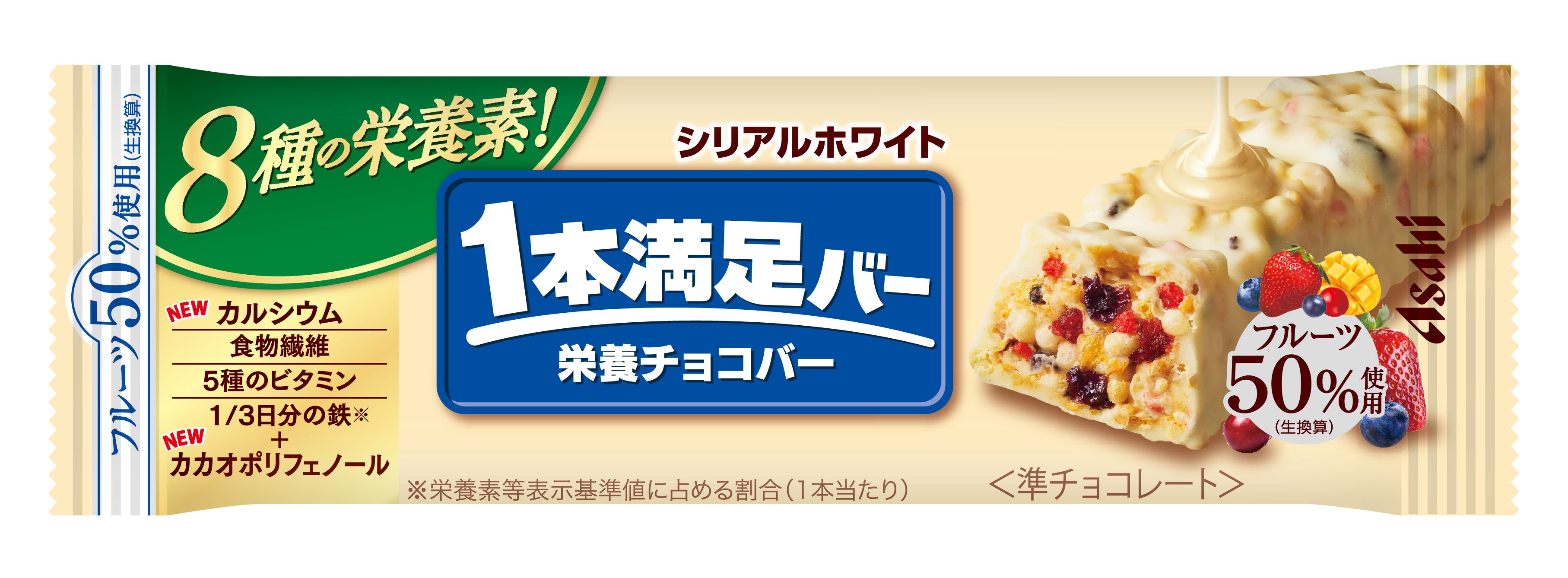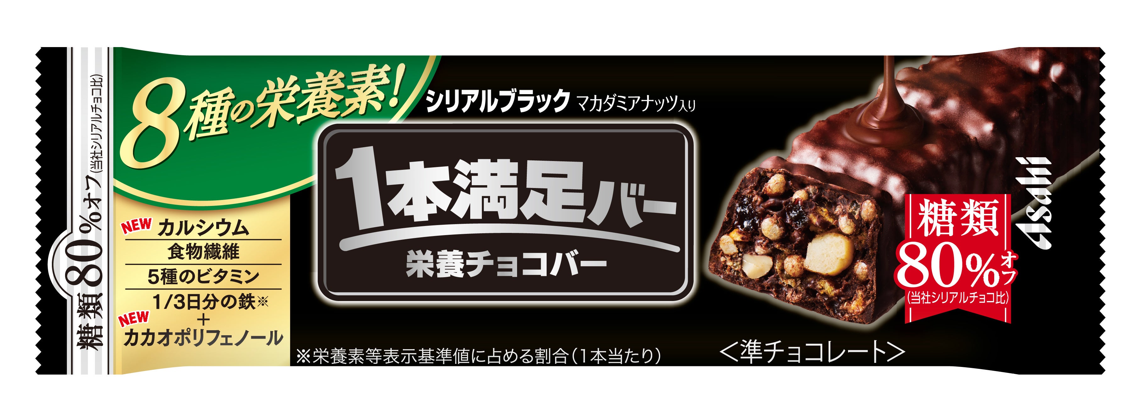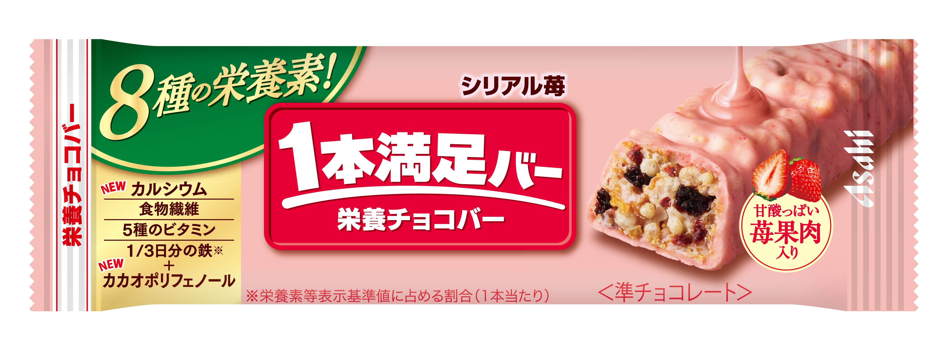 ・1本当たり8種の栄養素(カルシウム・食物繊維・5種のビタミン※2・1/3日分※3の鉄)とカカオポリフェノールを配合しており、手軽に効率的に栄養補給ができます