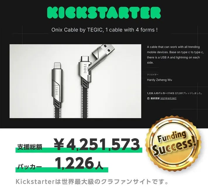 世界最大級のクラウドファンディング「KICKSTARTER」でも注目を集めた4in1充電ケーブルが、さらに進化して日本に上陸しました。