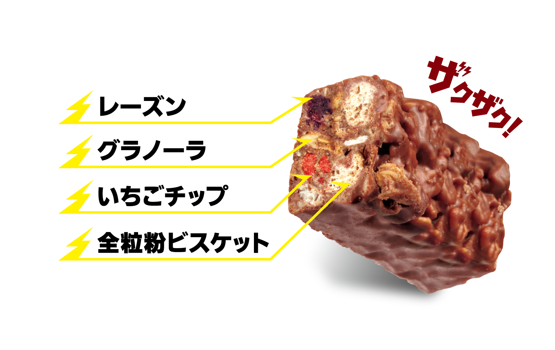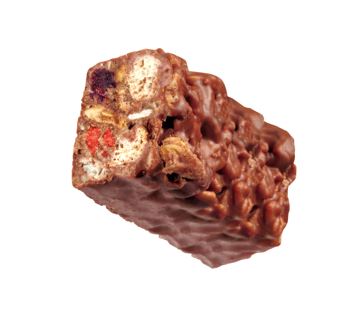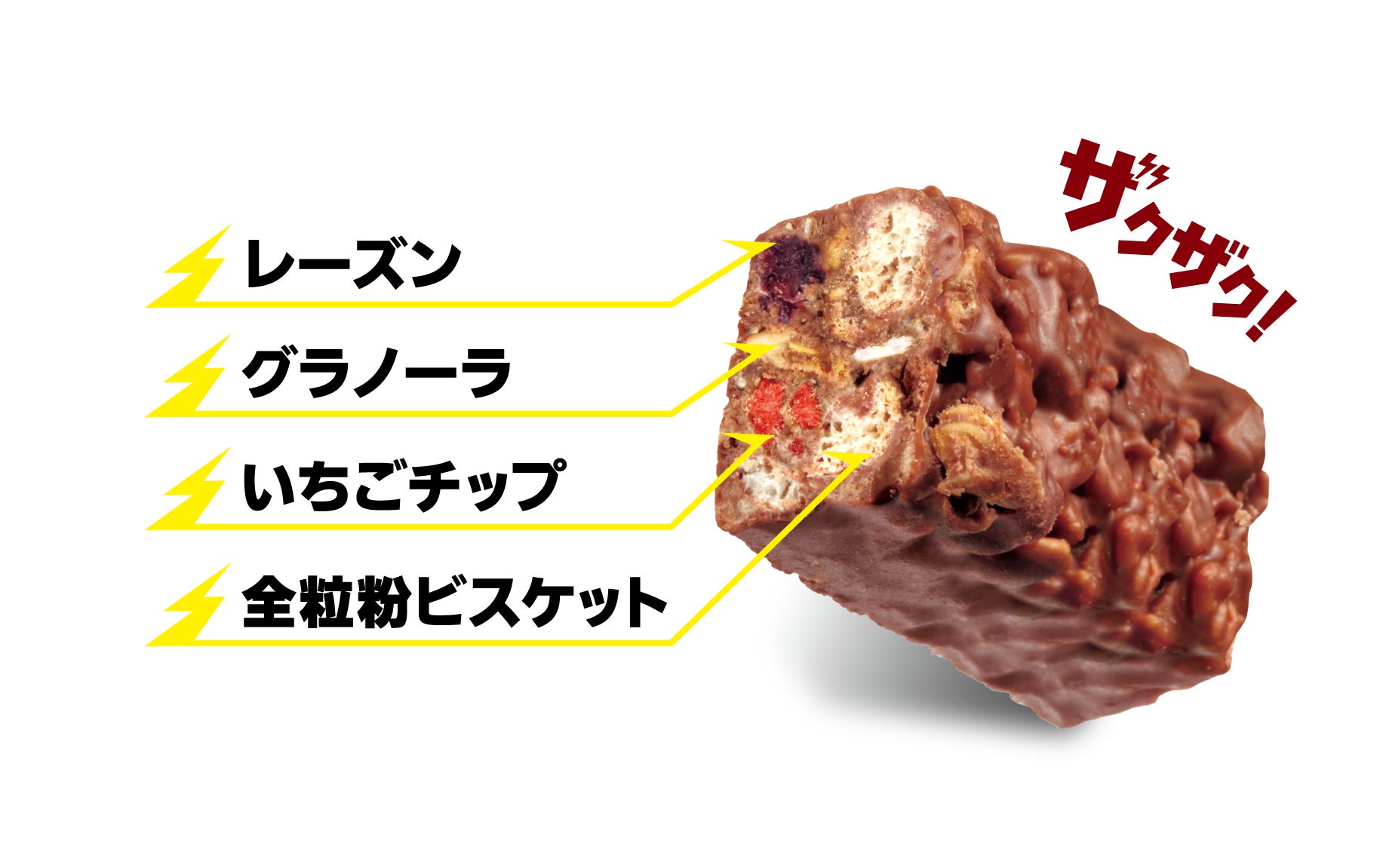 グラノーラサンダーミニバーでは、香ばしさのあるグラノーラ・全粒粉ビスケットと酸味のあるいちごチップ、甘みのあるレーズンをメインに、ライスパフ、オーツ麦を組み合わせました。6種の具材の味わいと食感を活かした、ザクザク感をお楽しみいただける商品に仕上げました。