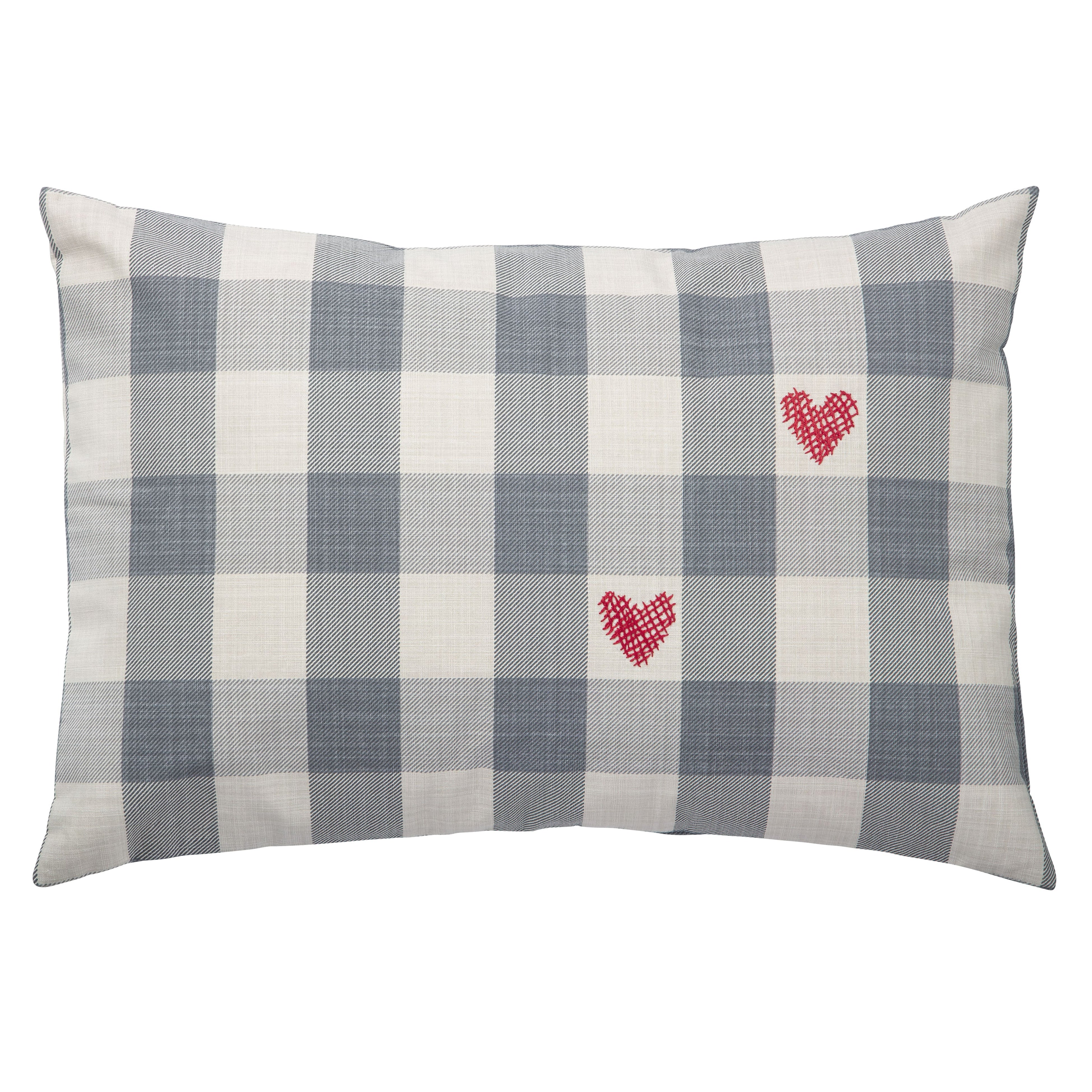 チェックのクッションカバーに表にクロスステッチで赤いハート形を2つ手刺繍したクッションカバー。ハンドメイドなので仕上がりが微妙に異なります。社会的企業Jordan River Foundationによるハンドメイド製品。