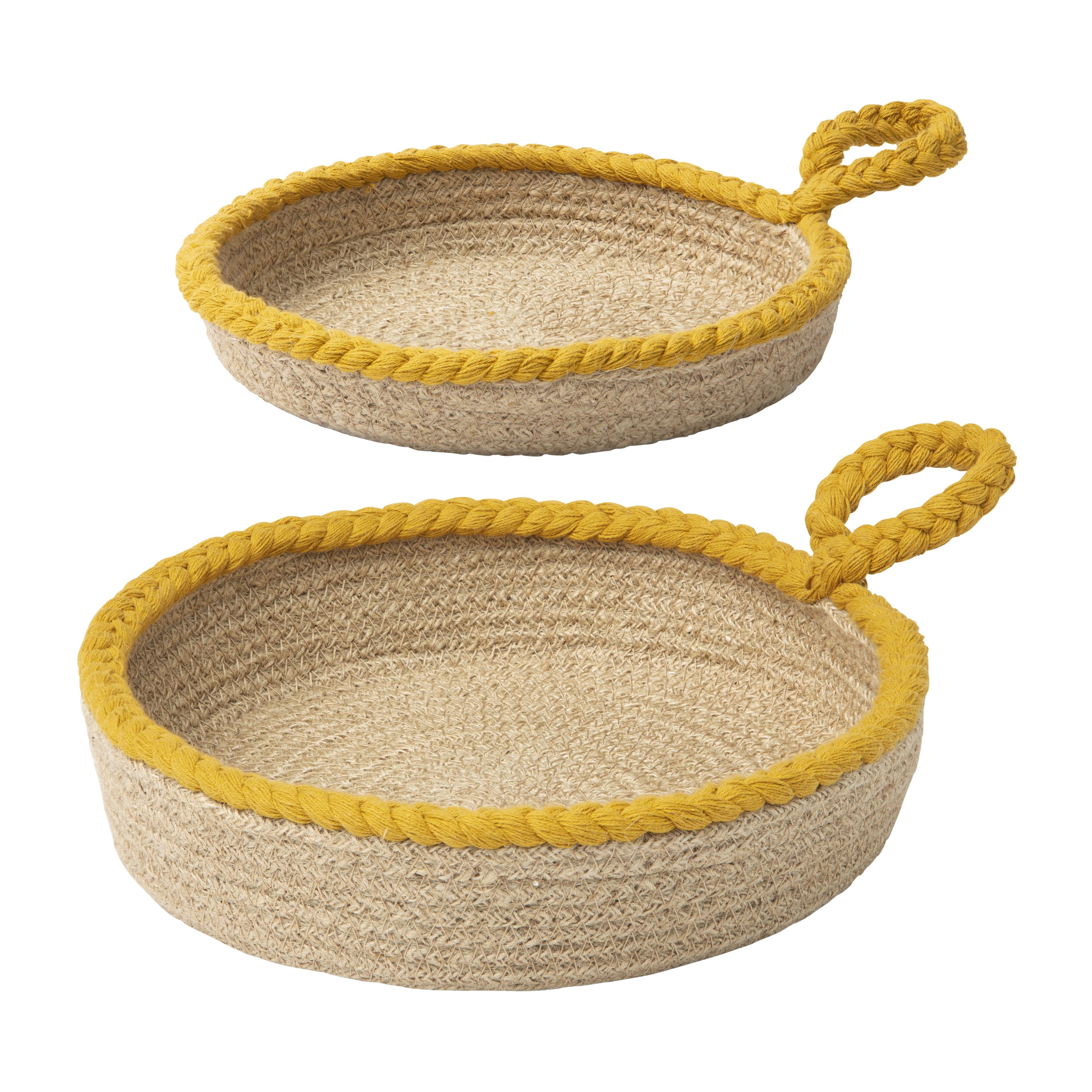 手編みのイエローの縁が付いたシンプルなジュート製バスケットで、室内に自然の要素を取り入れましょう。装飾的かつ実用的で、ジュエリーからアクセサリーまで、あらゆるものの収納に最適です。テーブルや棚に置くのに最適。小さなループで壁掛けデコレーションにもできます。ジュートは耐久性のある素材で、自然な色合いの変化が楽しめます。バングラデシュの社会的企業のClassicalによる製品。