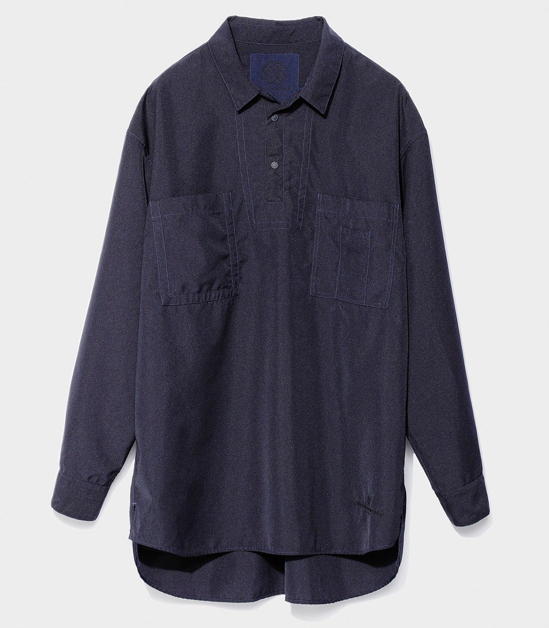 オーバーサイズのプルオーバーシャツ。袖口を捲りやすくするため、深めのスリット開き仕様に。再生ポリエステルを天然繊維のような風合いに表現。