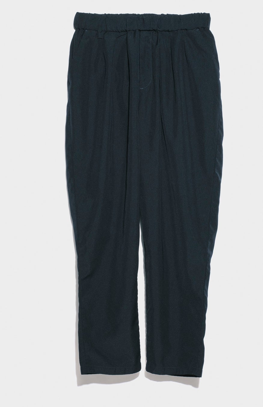 3タックのテーパードパンツ。腰周りにあまり分量を入れずに仕上げた細身のシルエット。ベルト内側のスピンドルでサイズアジャストが可能。