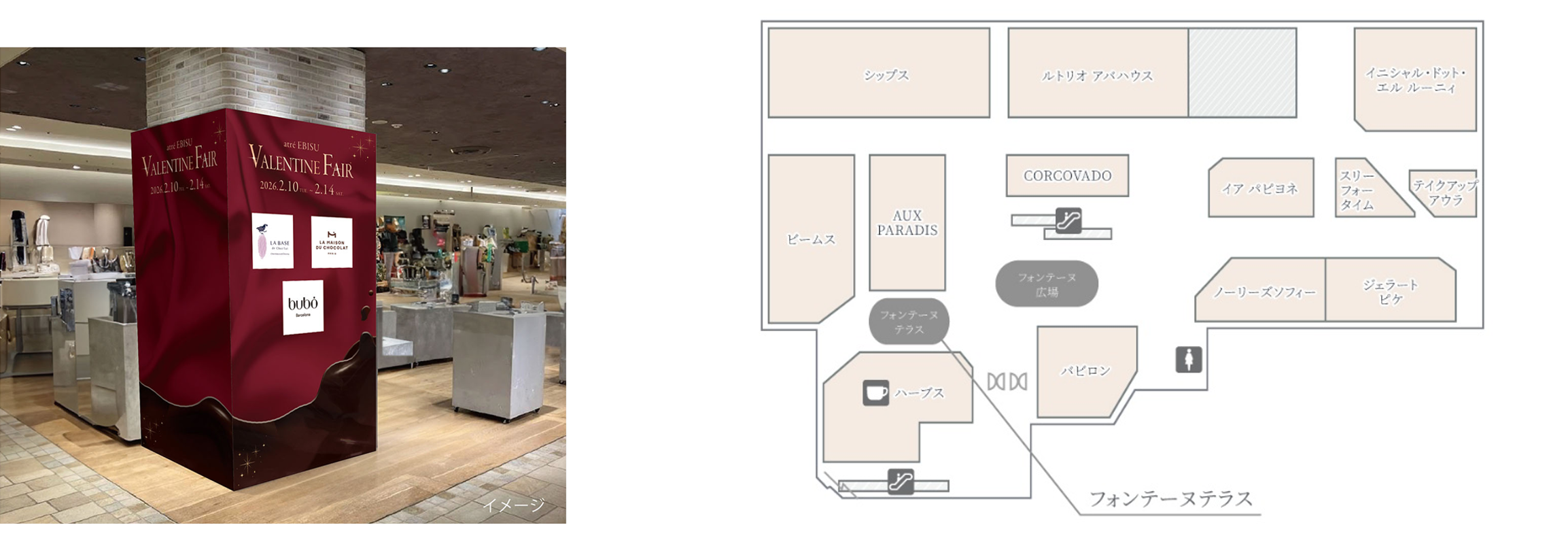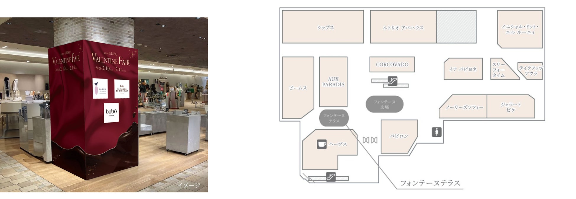 バレンタイン仕様になった「本館4階フォンテーヌテラス(ビームス・ハーブス前)」とJR恵比寿駅直結の「本館3階コンコース」の2会場で、趣の異なるスイーツをご提案します。