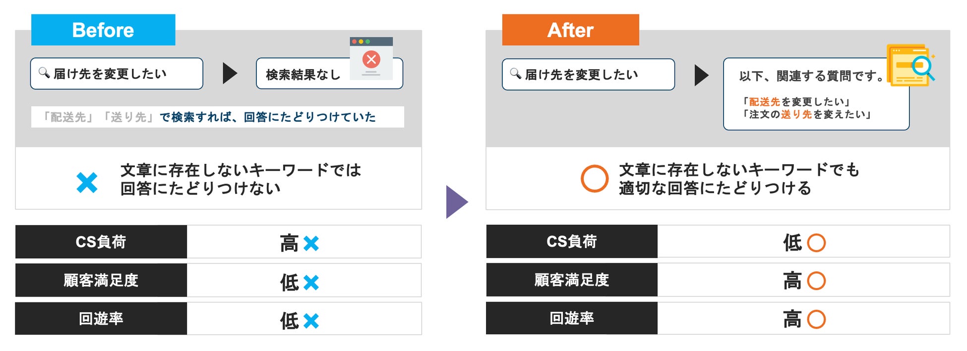 例として、「届け先を変更したい」と検索しても結果が表示されない一方で、同じ質問意図を持つ「配送先を変更したい」や「注文の送り先を変えたい」といった検索では、目的の回答が見つかることがあります。