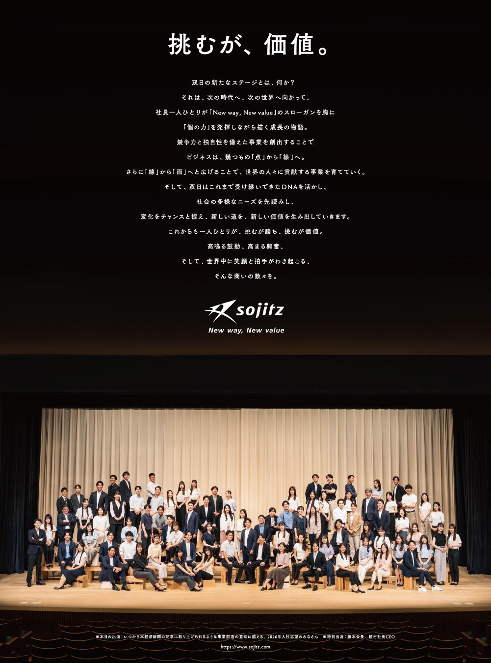 双日株式会社(以下「双日」)は、2026年春入社予定者の内定式に合わせ、内定者と、当社会長の藤本と社長の植村が共演する企業広告「挑むが、価値。2025」を日本経済新聞朝刊(10月1日付全国版)に出稿しました。