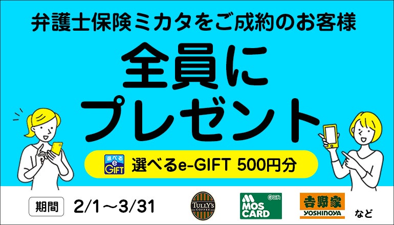 2/1〜3/31限定!「弁護士保険ミカタ」契約で500円e-GIFT【弁護士保険STATION】