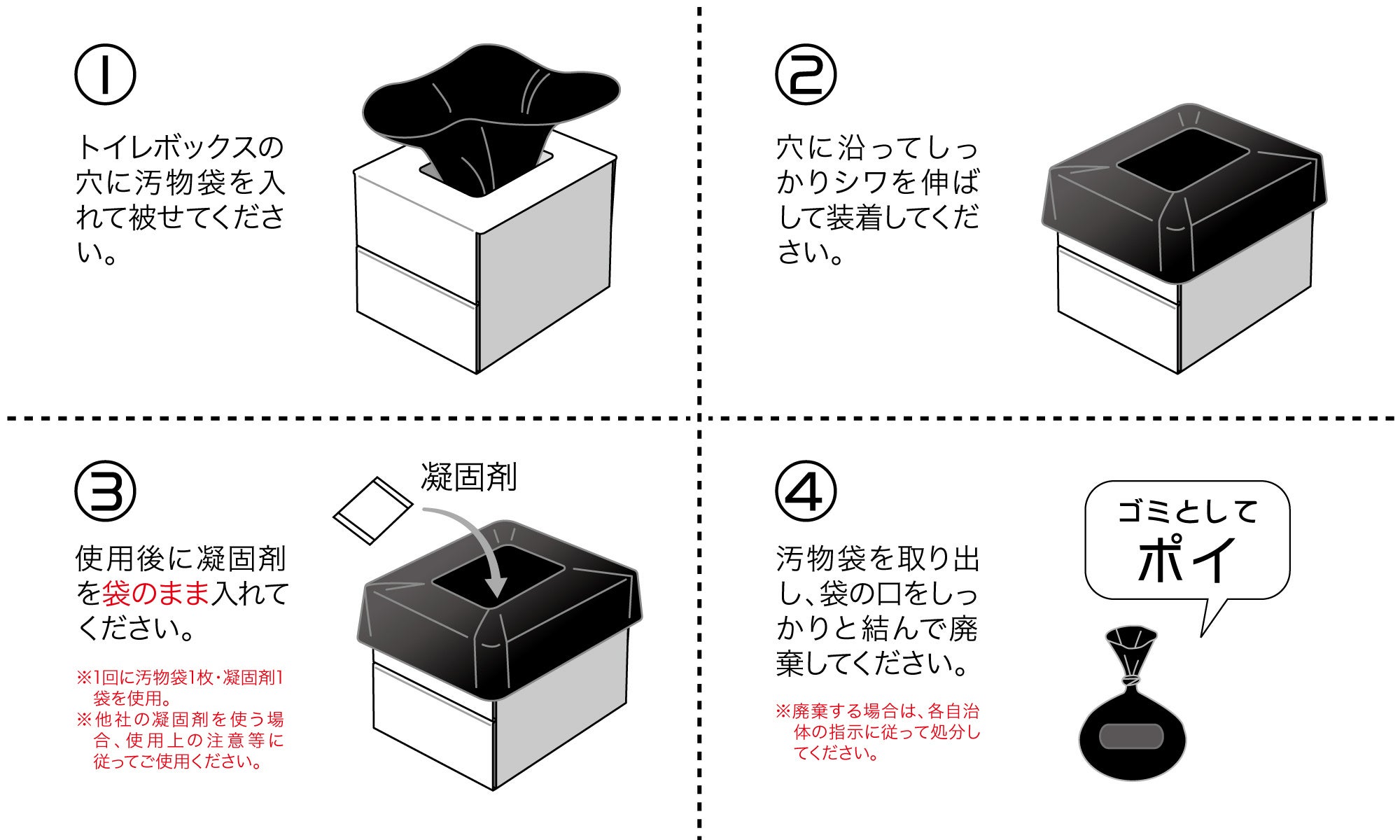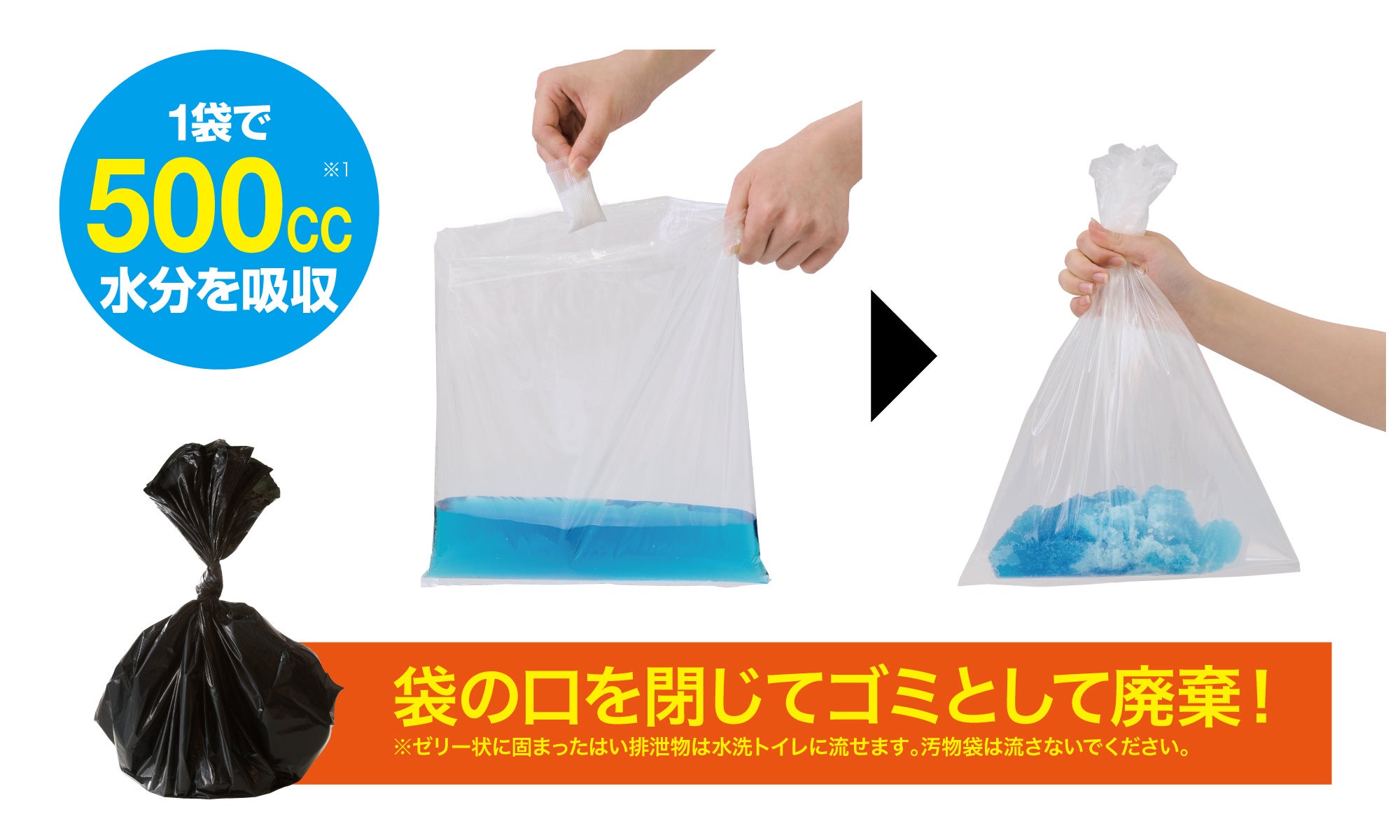 ※ゼリー状に固まった排泄物は水洗トイレで流せますが、汚物袋は流さないでください。