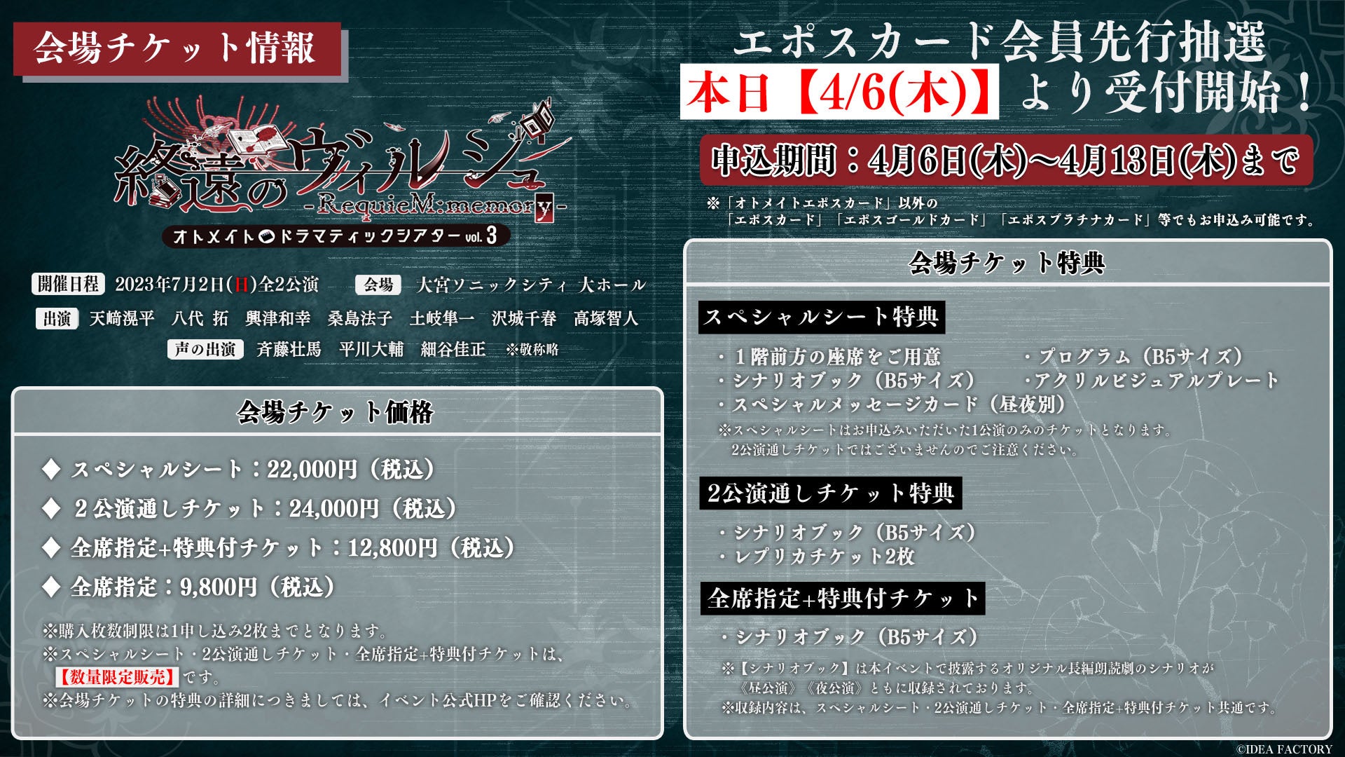 アイディアファクトリー株式会社の女性向けゲームブランド「オトメイト」は、7月2日(日)に開催する、朗読イベントシリーズ・オトメイトドラマティックシアターvol.03「終遠のヴィルシュ -RequieM:memory-」のエポスカード会員先行チケット抽選のお申込み情報をご案内いたします