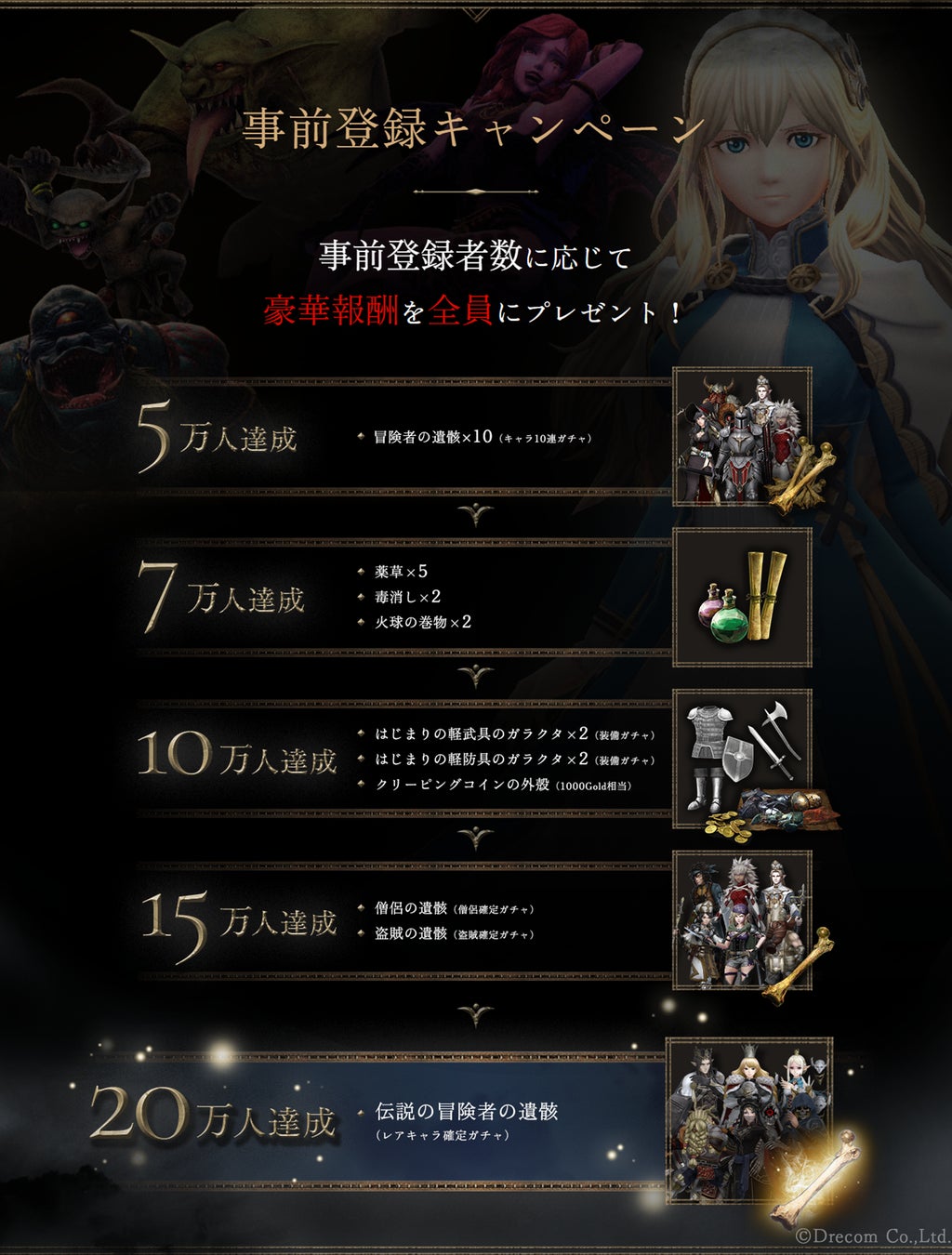 事前登録期間中の登録数に応じて、仲間や装備、特別なアイテムなど、ゲーム内で使用できる豪華報酬を全員にプレゼントするキャンペーンを実施中です。