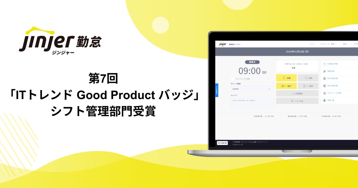 jinjer株式会社(本社:東京都新宿区 代表取締役社長:桑内 孝志)が提供するクラウド型勤怠管理システム「ジンジャー勤怠」は、株式会社Innovation & Co.(本社:東京都渋谷区、代表取締役社長:齊藤 和馬)が提供する法人向けIT製品・サービスの比較サイト「ITトレンド」が発表するGood Productバッジをシフト管理部門で受賞したことをお知らせします。